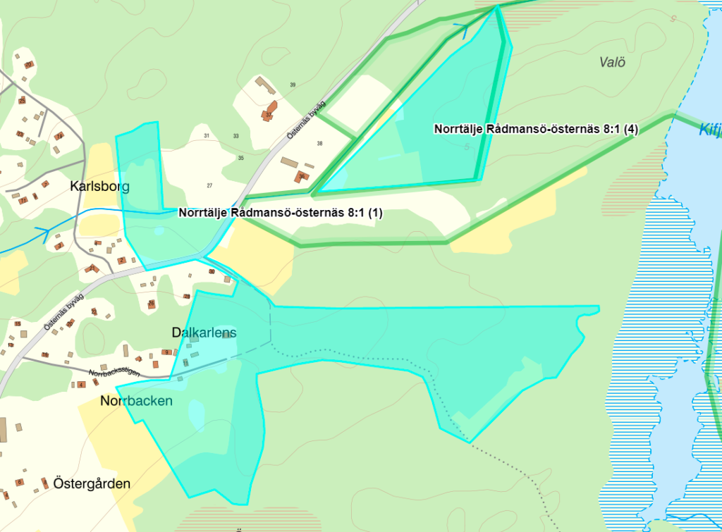 Gårdens nuvarande sträckning markerad med blå färg