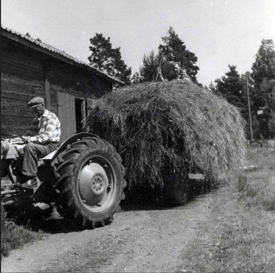 Mangårdsbyggnaden stod klar 1912 och ladugården som tyvärr är riven idag stod klar 1897. Här ser vi min morfar Soldan Gillemar som kör sin traktor, jag och min pappa Jojje Fredriksson på hölasset.