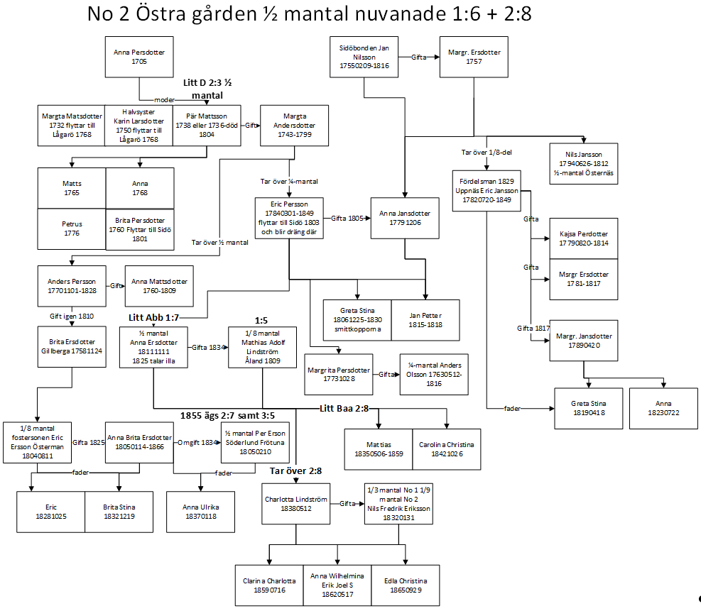 Vid Laga skifte hade gården betäckningen Ca eller 2:7 och 3:5. Idag är gården uppdelad. Men ursprungsgården hade beteckningen 1:6 och 2:8. Förvirrande? Ja åtminstone för mig.