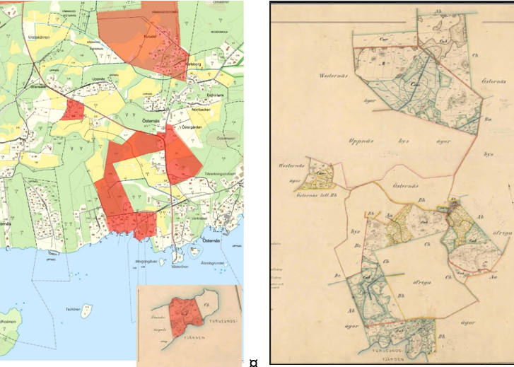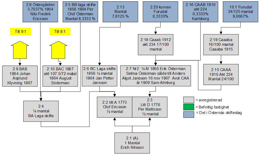 Ursprungsgården 1 (A) har delats upp flera gånger vilket även 2 (B) har gjort. Nedan visas en starkt förenklad ursprungsbild för denna gård.