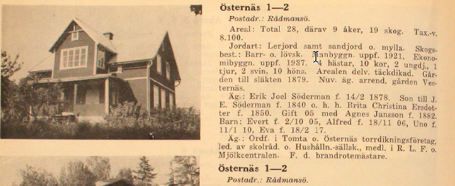När Uno gifte sig med Hilda styckades en tomt av, som idag heter Rådmansö-Östernäs 2:40 samt 2:48. Alfred Söderman arrenderade ett tag ett jordbruk mitt emot Västernäs affär. Han ägde även det s.k. Uppnässkiftet som hade fastighetsbeteckningen Norrtälje Uppnäs 1:8 (Uppnäs 1 CB) som var på 1/16-dels mantal och på totalt 4,25 ha. 1938 avstyckade han och sålde en del av skiftet till Oskar Nyberg för 1500 kr. Den fastigheten kallas idag för Norrtälje Uppnäs 1:29. Den var då på totalt 2,27 ha. Han ägde troligen redan då fastigheten Norrtälje Uppnäs 1:22 som Algot Jansson styckat av 1915.Sedan tidigare 1,5 ha av fastigheten styckats av, se CB (1:8) på kartan nedan. Dessa tomter heter idag Norrtälje Uppnäs 1:86, 1:87 samt 1:88.