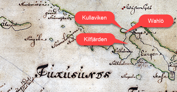 Wahlö är där Kilfjärden viker av upp mot Kullaviken. Namnet Wahlö kan härstamma från att en val fastade här när den förirrade sig in mot Kullaviken.