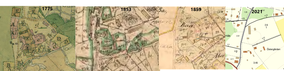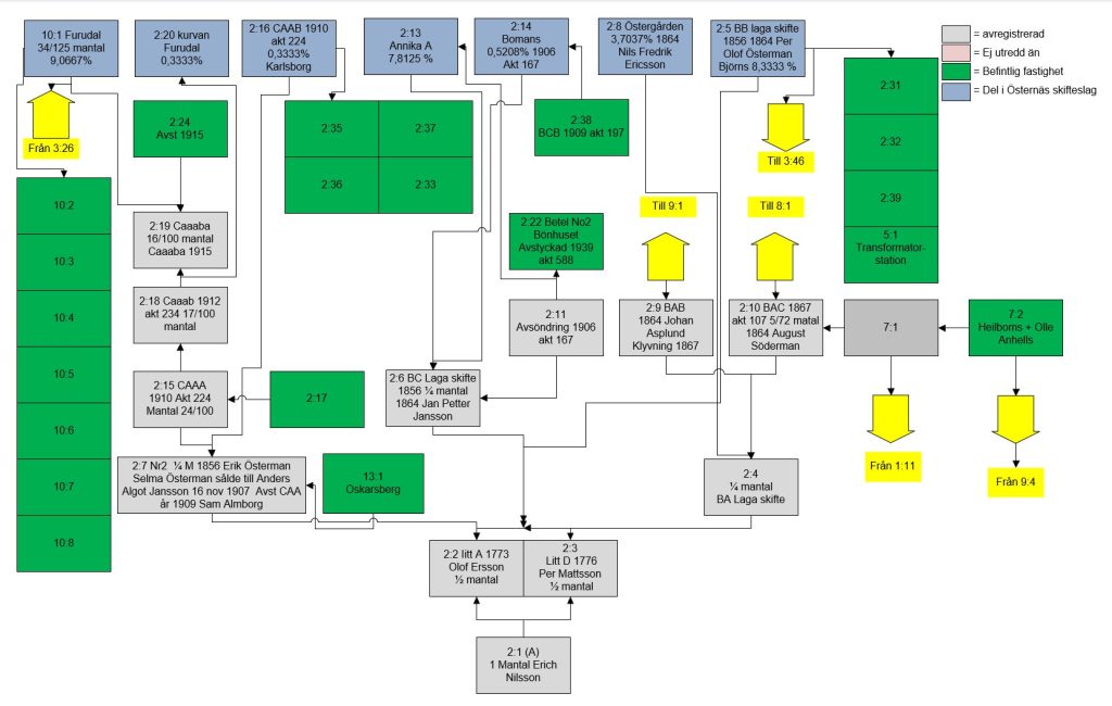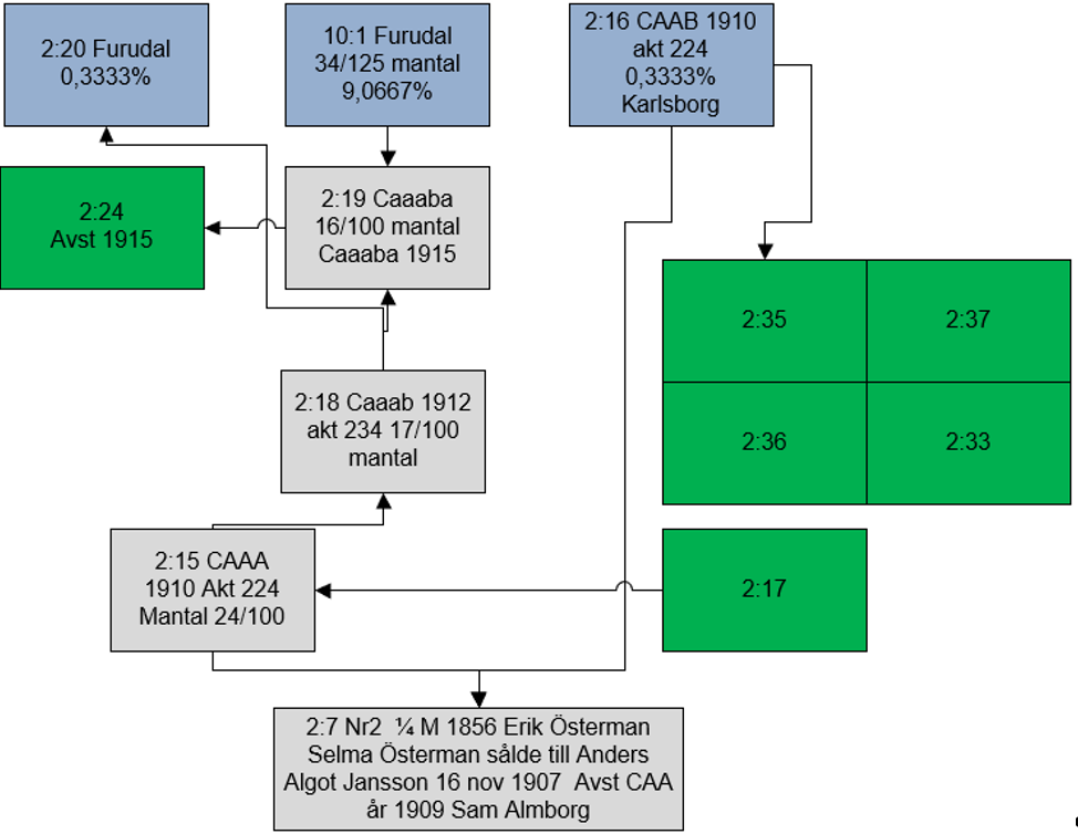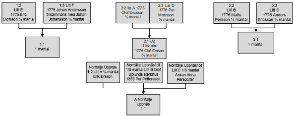 Dessa fastigheter har styckats av en mängd antal gånger till mindre jordbruk och fastigheter. Det har också slagits ihop olika fastigheter från olika grundfastigheter.