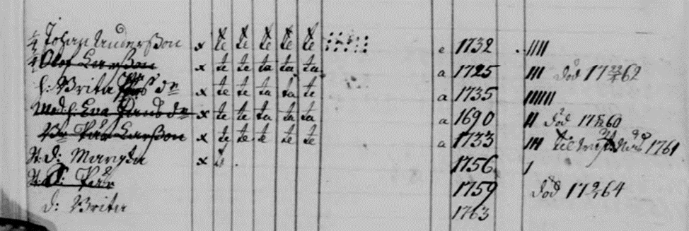 Den äldsta boende i Östernäs by jag hittat i kyrkböckerna är mor Eva Persdotter född 1690 som ni ser här ovan. Sedan kommer Brita Olofsson 1696–1775 och hennes man Erich Nilsson 1699–1761. Det finns olika årtal i kyrkoböckerna för när Brita föddes 1696 och 1697.