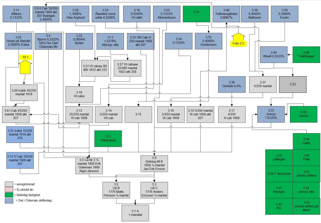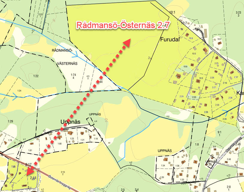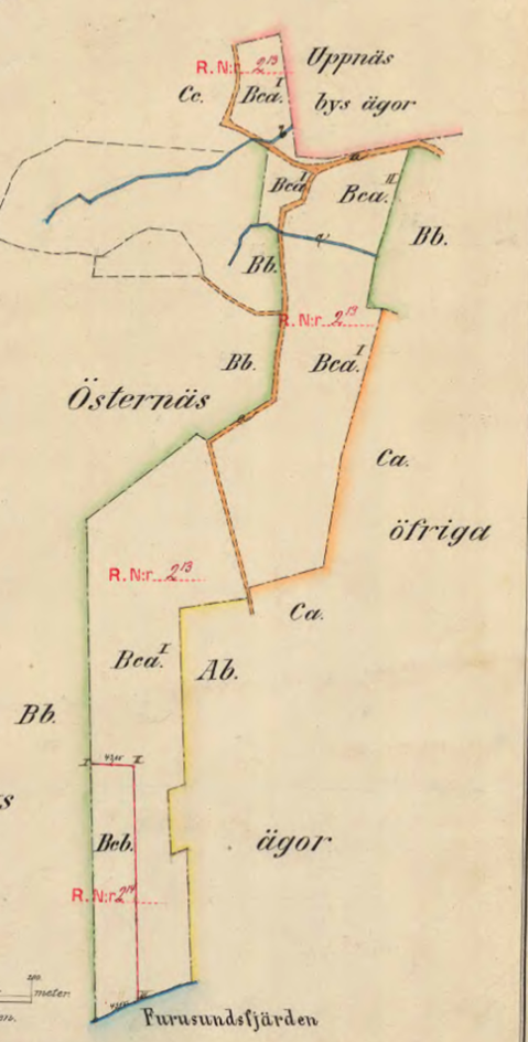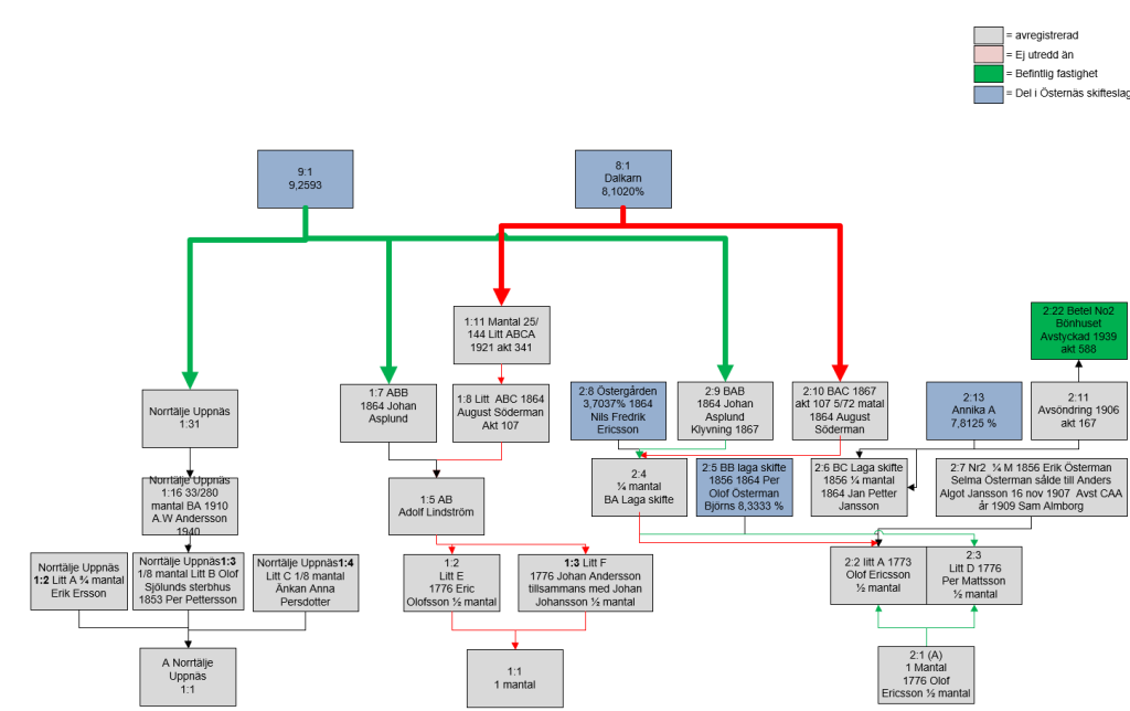 År 1954 bildades fastigheterna som började på 8 – 11 genom sammanläggningar av andra fastigheter. Som exempel kan vi ta min fastighet som heter Rådmansö – Östernäs 9:1. Den har sitt ursprung från Rådmansö-Östernäs 1:7 och 2:9 samt Norrtälje Uppnäs 1:31. Nedan ser ni ett urklipp över min fastighets ursprung. Men mer om detta senare.