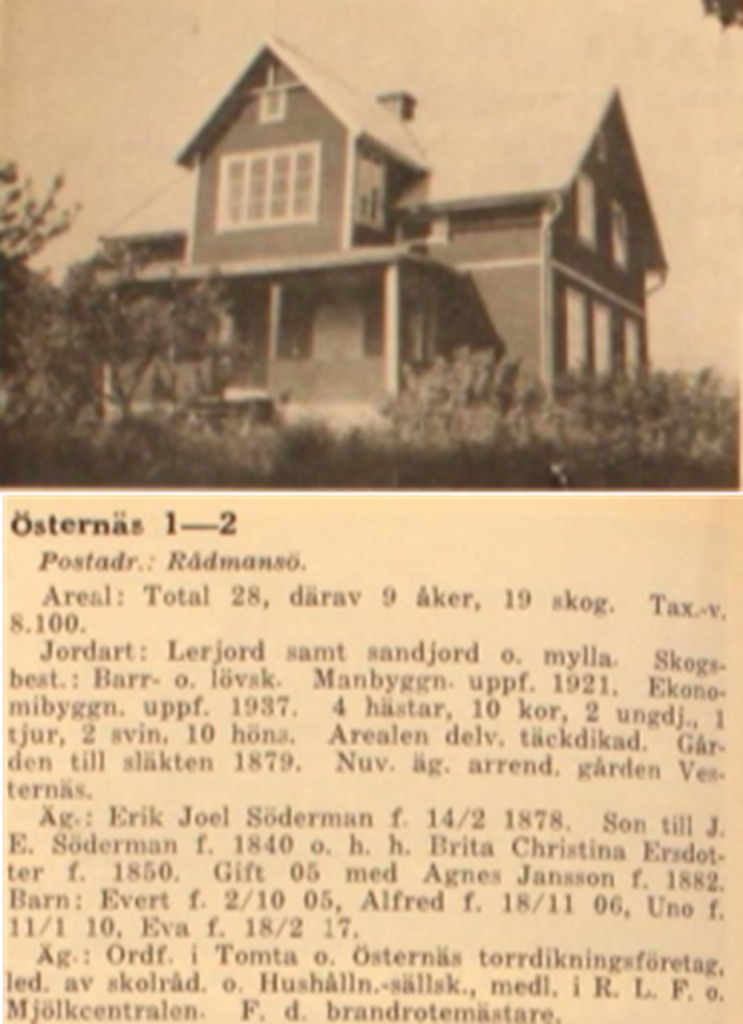 Bror Fredrik Jonsson köpte Oskarsberg 11 enligt köpebrev 26 januari 1934 och köpebrev 4 januari 1935 av Östernäs 11 ägdes fr.o.m. 1935 av Johan Oskar Söderman född 1866 och hans hustru Amanda född Dahlen 1875 Folkja Nora församling (Ligger mellan Härnösand och Örnsöldsvik). Johan Oskars pappa var bonde i Gräddö och hette Jan Petter Söderman född 1821-09-10. Hans mor hette Carolina Persdotter född 1830. Oskar i sin tur köpte Oskarsborg från Selma Österman född Jansson för 550kr.