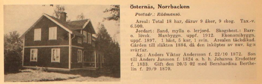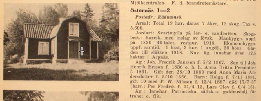 Fastigheten är avstyckad från Rådmansö-Östernäs 2:17. Nuvarande byggnad uppfördes 1909. Här bodde Matilda Jansson, född Persdotter 1853 med sin man E J E Jansson. Gården togs sedan över av sonen Karl Fredrik Johan Jansson född 1887. När han dog 1923 tog brodern, snickaren August Viktor Jansson född 1887 över gården med sin hustru Alma Matilda, född Andersson född1883.