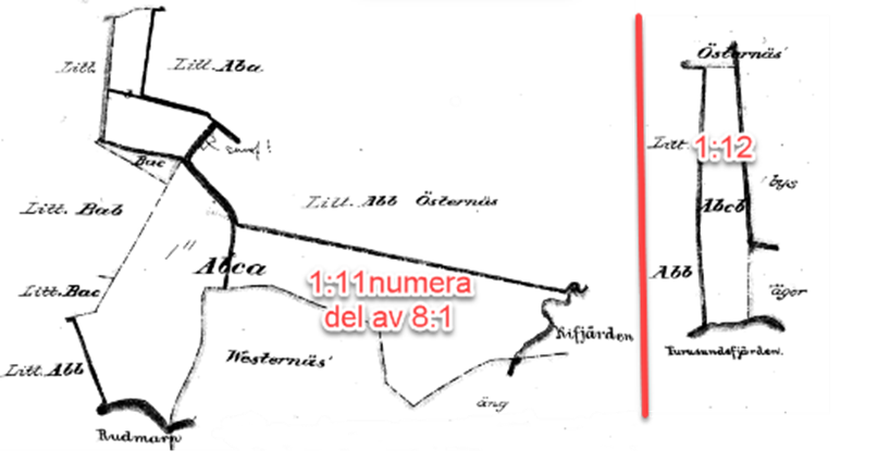 De tre hemmanen på Östernäs hade grundbetäckningen1–3 och på kartor angavs de med A-C. Ofta men inte alltid kan man säga att alla fastigheter som heter Rådmansö-Östernäs och börjar med 1,2, eller 3 härstammar från No 1, 2 eller 3. Vid styckning av tex A kallades dessa för Aa och Ab. För att kunna fortsätta att beskriva hur Östernäs utvecklades måste vi åtminstone ta med Uppnäs men även ibland delar av Västernäs. Nedan ser ni de 4 grundgårdarna och hur de första gången blivit delade.