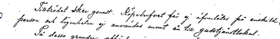 I köpebrevet står att fastigheten ej får överlåtas på egen person och lägenheten ej användas annat än till gudstjänstlokal, se nedan.