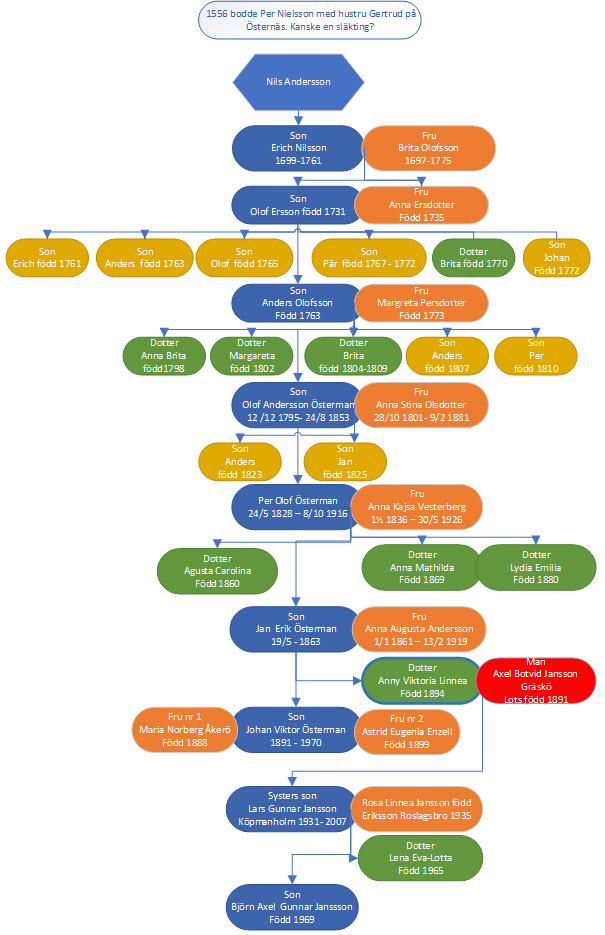 E Norrtälje Östernäs 12 Erich Olofsson född 1729 var gift med Maria Ericdotter född 1738. Deras barn var Margta 1757 som flyttade till till Sidö 1777, Kerstin 1763, Maria 1768, Anna 1774, Karin 1779. Erich hade tagit över gården efter sin far Olof Nilsson.