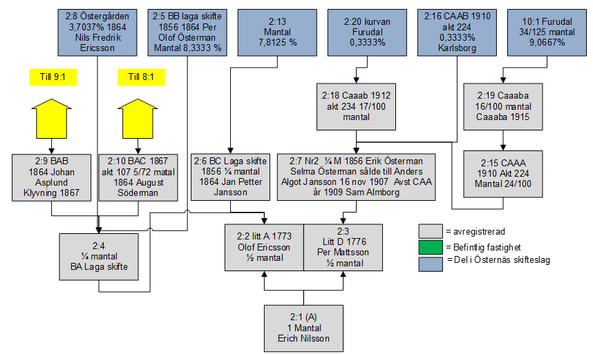 Gårdarna A (2:2) och D (2:3) delades sedan upp i 2:4, 2;5, 2,6 och 2;7. Idag hör den marken till gårdarna 2:8 som ägs av Thord och Britt-Marie Söderman, 2:5som ägs av Björn Jansson, 2:13 Annika Almborg, 10:1 Furudal, 2:16 Karlsborgs huvudfastighet och som del av 8:1 Dalkarlen samt 9:1 Norrbacken.