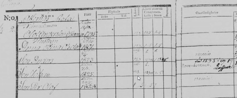 Som ni ser nedan står det att vissa barn vaccinerats. År 1816 blev det obligatoriskt i Sverige att alla barn under två år skulle vaccineras. Reformen gav snabbt resultat och dödligheten i smittkoppor minskade kraftigt under 1800-talet, kanske också på grund av en mutation som minskade smittans aggressivitet.