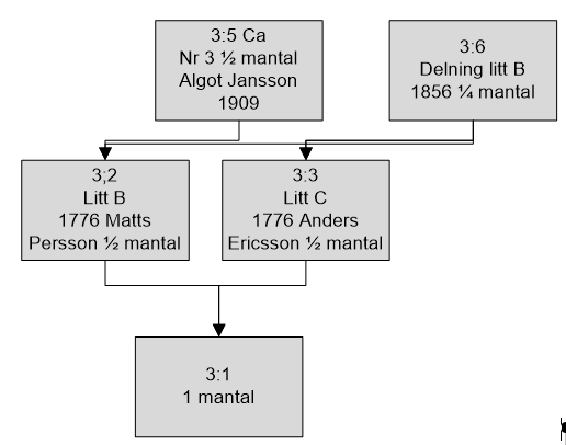 Redan 1773 var gården uppdelad och vid storskiftet delades den ytterligare upp. Vid laga skifte 1856 var fastighetsbeteckningarna 3:5 och 3:6